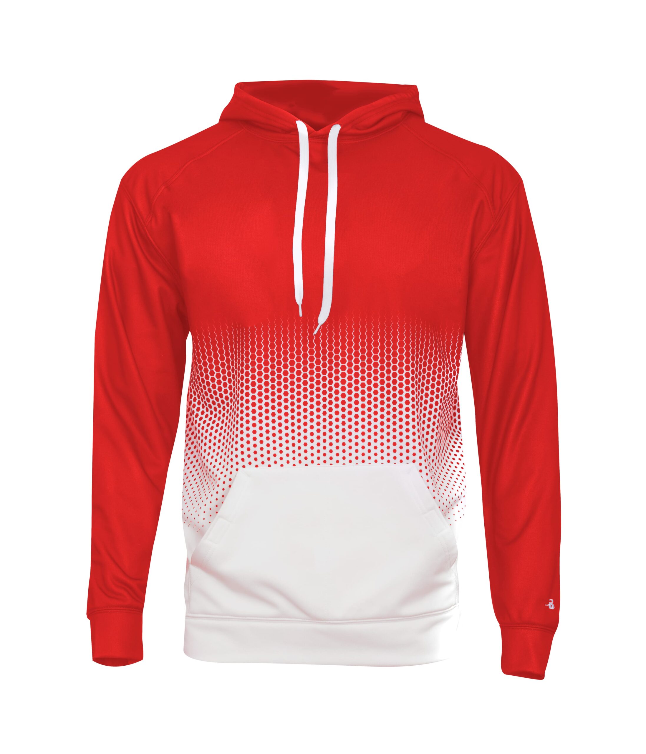 * 100% Polyester moisture management fleece fabric * Badger Sport shoulder for maximum movement * Sublimated front and back body, sleeves, shoulder and hood * Front pouch pocket with two hook & loop closures and headset opening * Self-fabric cuffs & waistband * Embroidered Badger logo on left sleeve * Self-fabric cuffs & waistband * Embroidered Badger logo on left sleeve