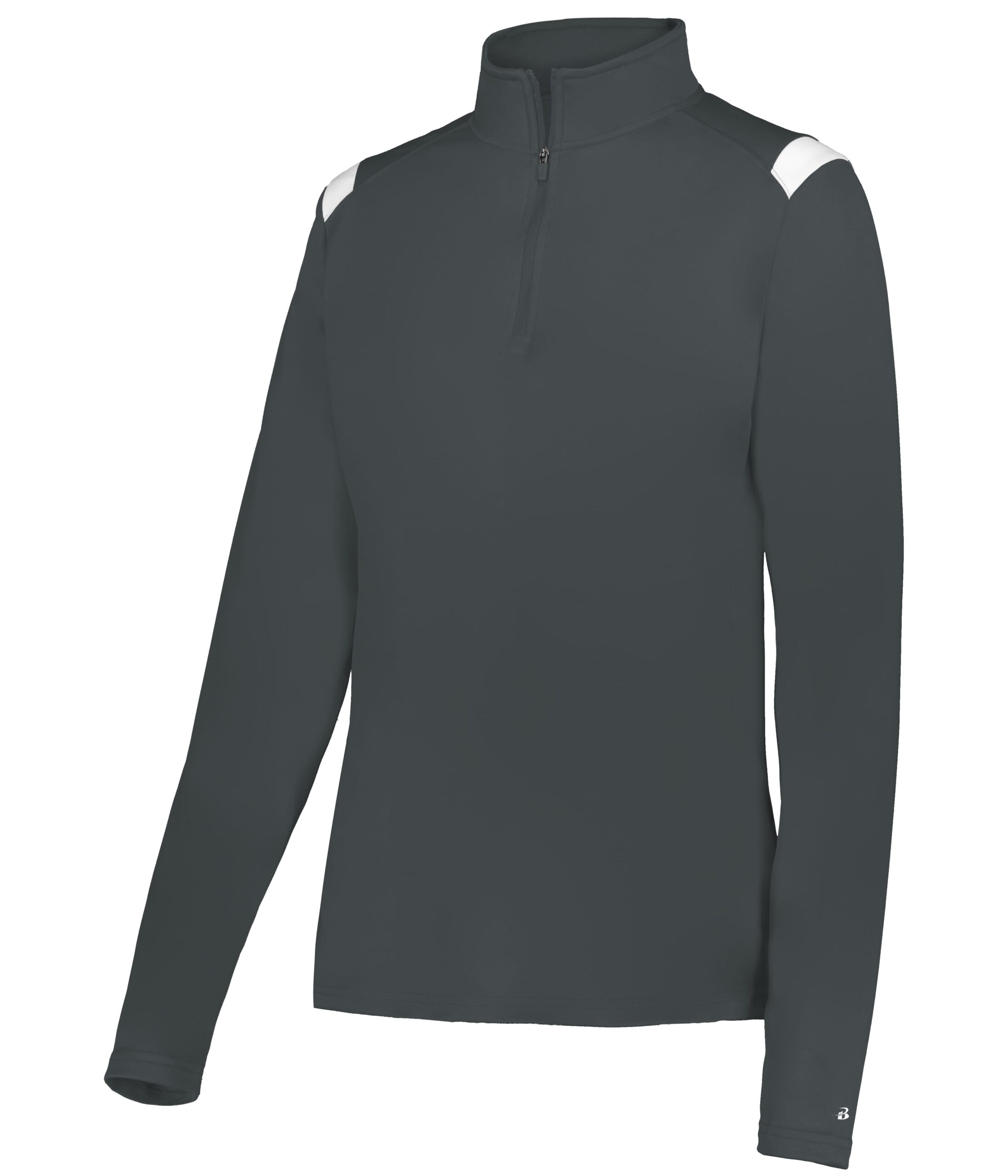 * 100% polyester * Wicks moisture * Odor resistant * Ladies’ fit * Tag-free label * Quarter zip pullover style * Sport paneled shoulder for maximum movement