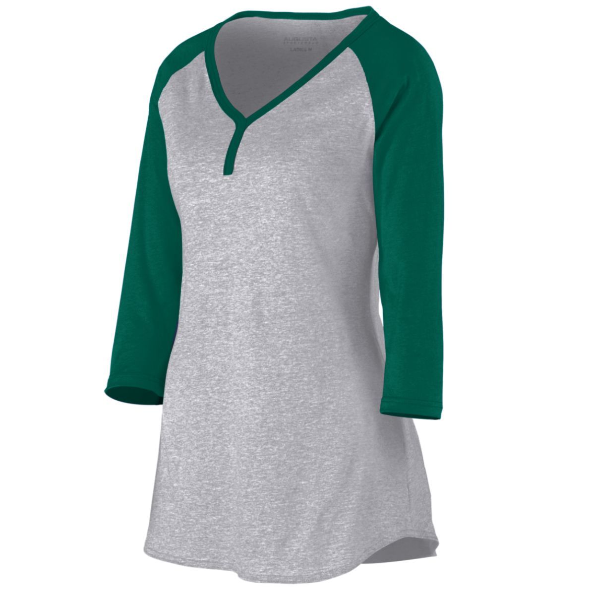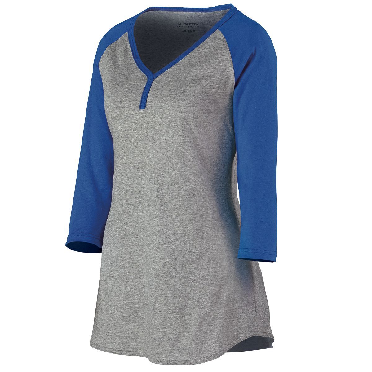 100% ringspun combed cotton * Ladies fit * Tagless label * Contrast rib-knit modified henley neck * Contrast color, three-quarter raglan sleeves * Double-needle hemmed sleeves and bottom * Shirttail hemline * Soft hand