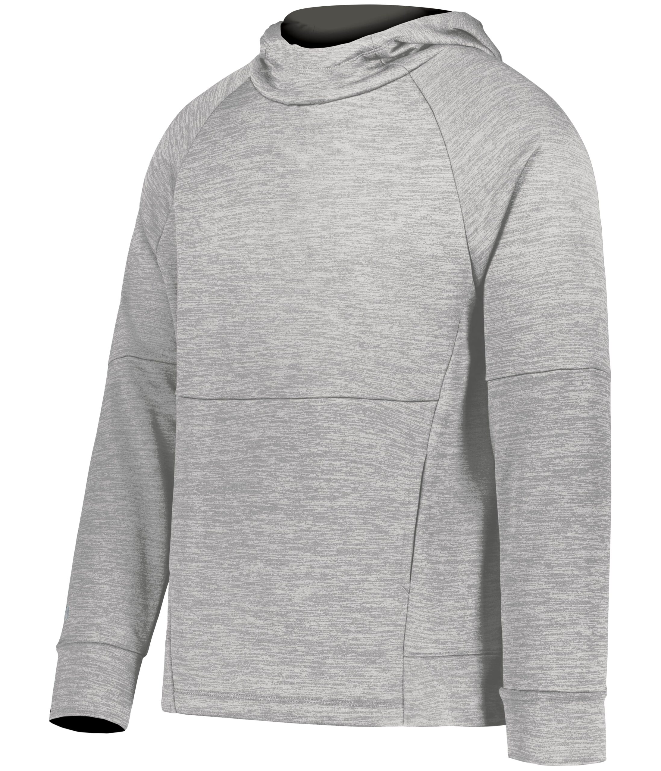 * 6.78-ounce, 100% polyester melange fleece * Woven label * Scuba shaped 3-piece hood * Raglan sleeves * Front pouch pocket with inner mesh cell phone or valuables pocket * Self-fabric cuffs * Open bottom