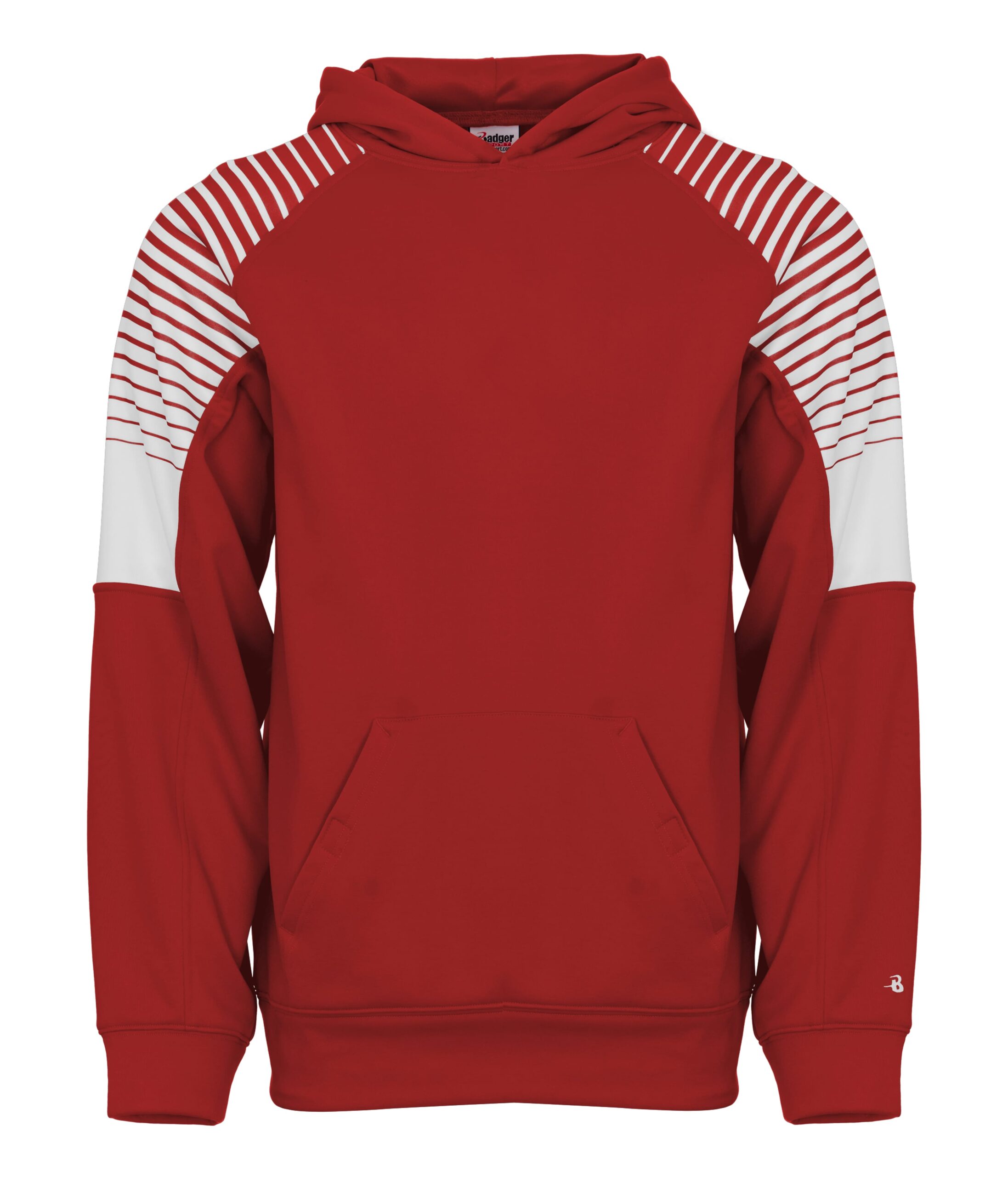 * 100% Polyester moisture management fleece fabric * 100% Polyester moisture management/odor protection fabric hood lining * Sublimated raglan sleeve panels * Front pouch pocket with two hook & loop closures at top of pockets with headset opening * Self-fabric cuffs & waistband * Embroidered Badger logo on left sleeve * No drawcord